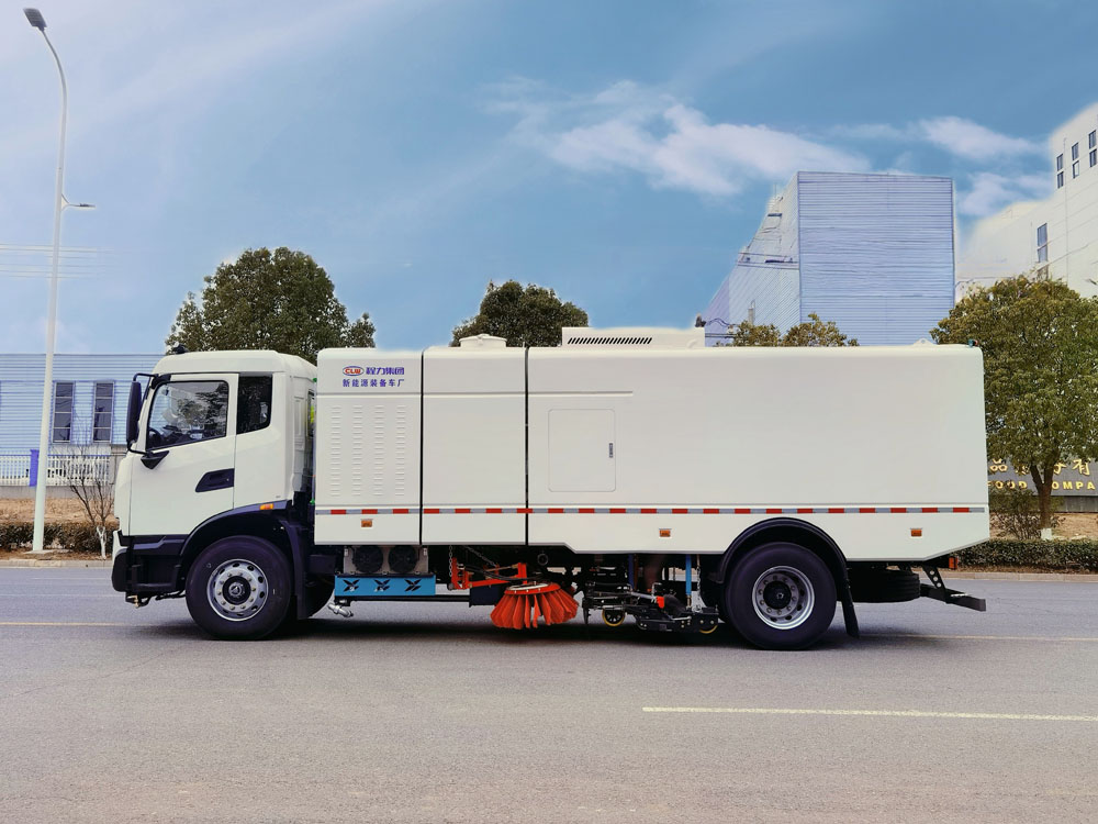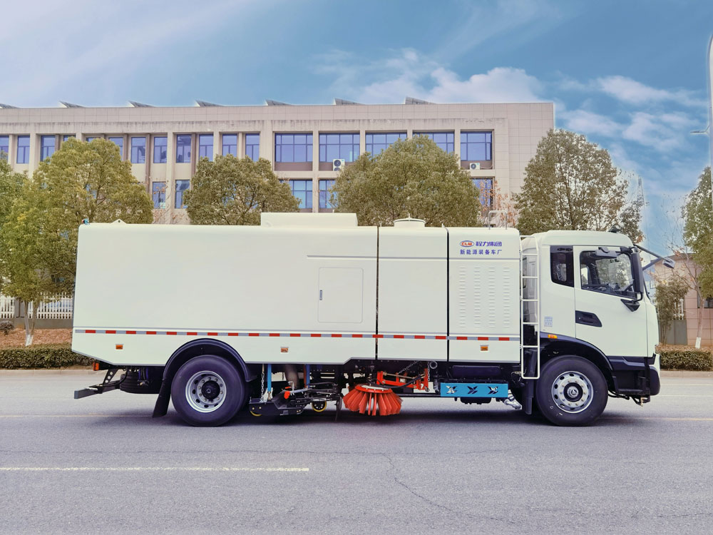 該洗掃車的清掃系統采用“中置兩立掃+中置寬吸嘴+吸嘴高壓中噴桿+左、右高壓側噴