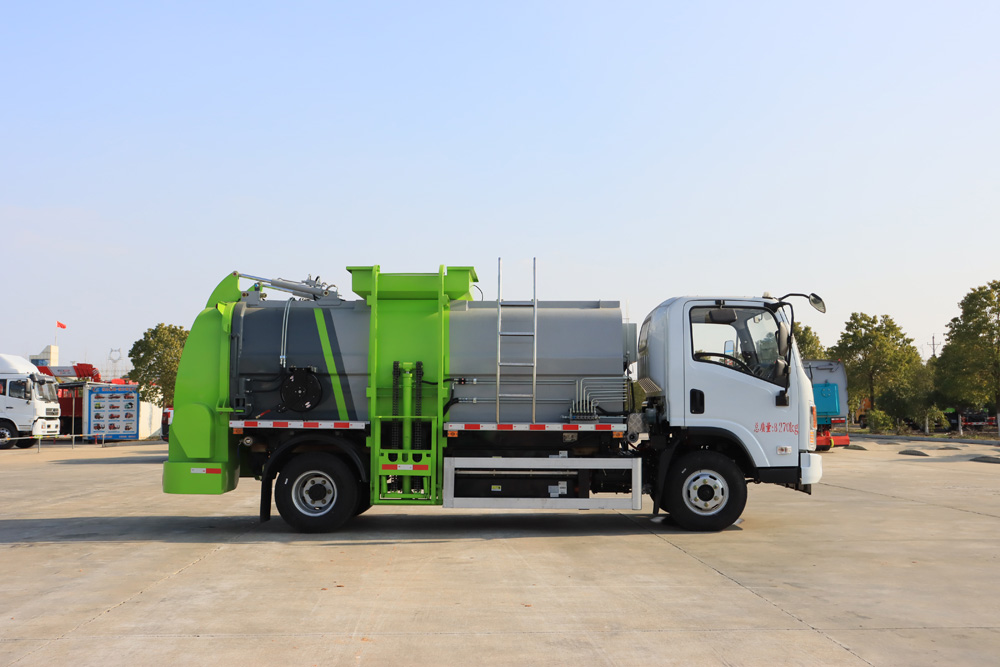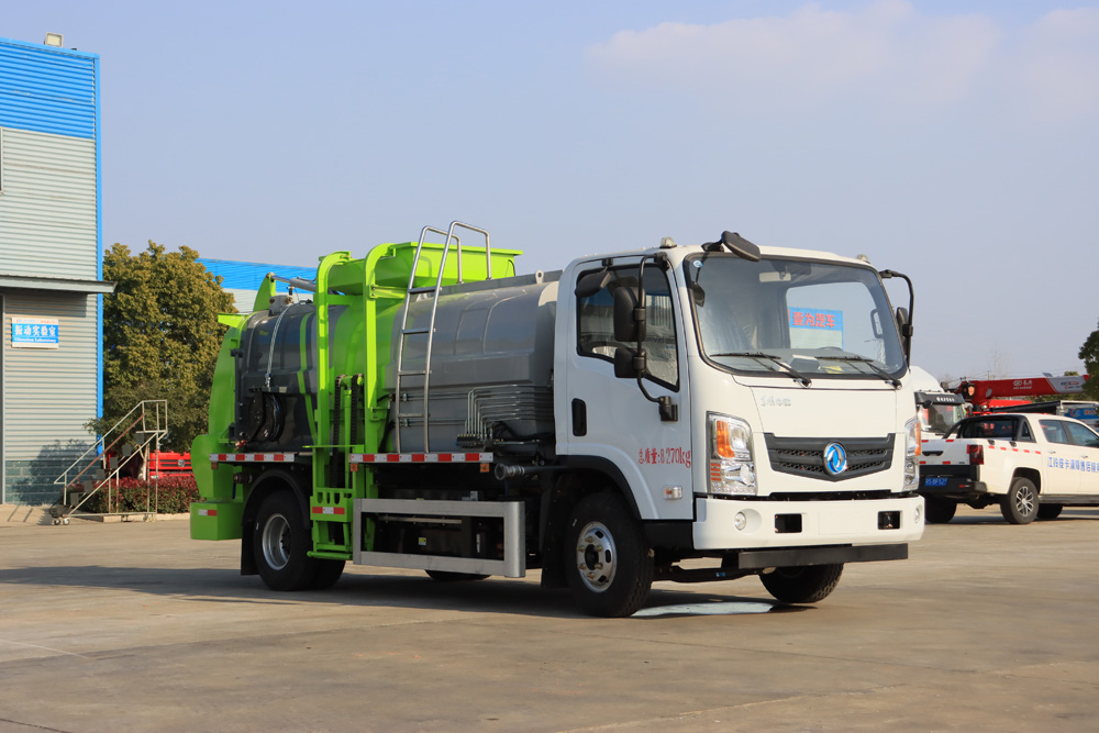四、其他說明: 東風純電動餐廚垃圾車是在東風純電動二類底盤的基礎上,加裝垃圾箱、垃圾桶提升機、清洗裝置、液 壓系統,由機械、液壓(氣路)、電器三部分合為一體的專用廚余垃圾處理、轉運作業車。 工作原理:整車為全密封型,自行壓縮、自行傾倒、壓縮過程中的污水全部進入污水箱,徹底的解決了 垃圾運輸過程中的二次污染,具有壓力大、密封性好、操作方便。安全等優點。垃圾箱可實現箱內餐廚垃圾 固液的初步分離,并采用大容積污水箱,提高產品裝載量; 電控系統采用無線遙控,并通過作業動作邏輯互 鎖,保證操作的精準性,杜絕誤操作。