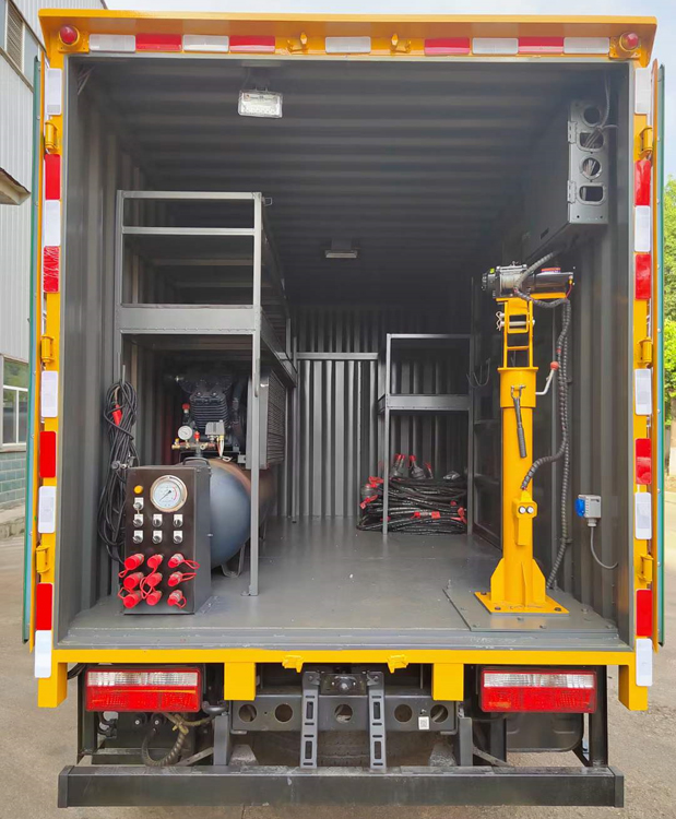 四、其他說明: 東風多利卡雙排座底盤,國六全柴115馬力,5檔變速箱,雙排座駕駛室 側面和后面各一個雙開門,箱內設計兩個貨架,箱內設計照明燈 安裝液壓動力系統,三套液壓動力取力快速接口,帶控制面板 兩臺4寸的渣漿泵,帶水帶和液壓管(帶快接) 裝一個液壓驅動空壓機,一個800公斤12V電控小吊機 安裝3500W逆變器,帶電控箱,其他標配