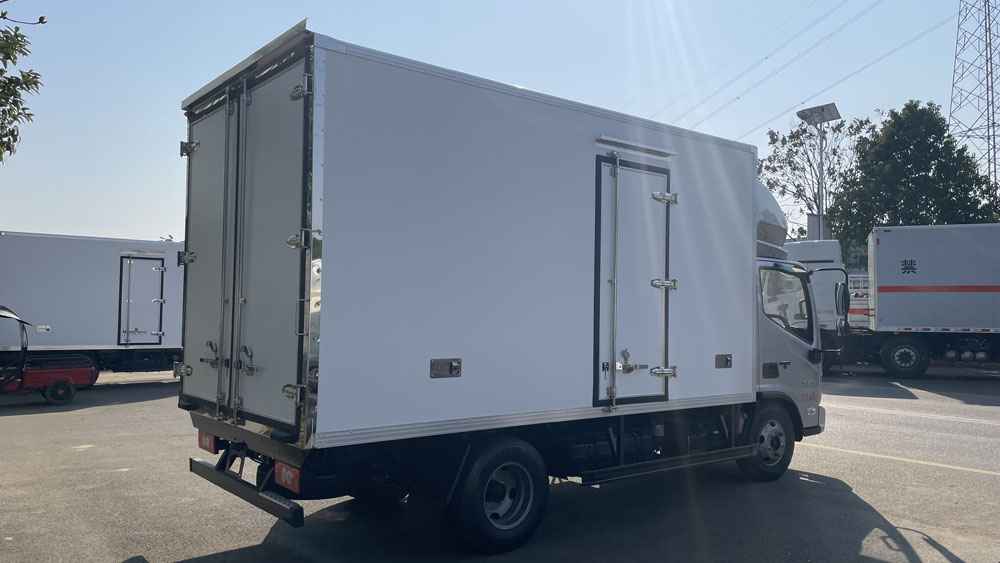 福田歐馬可4米冷藏車可在廂體頂部選裝軌道肉鉤、及在廂體底部選裝T型通風(fēng)槽