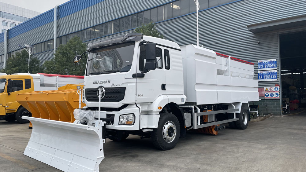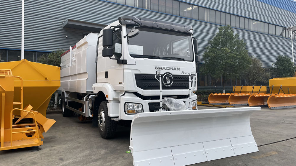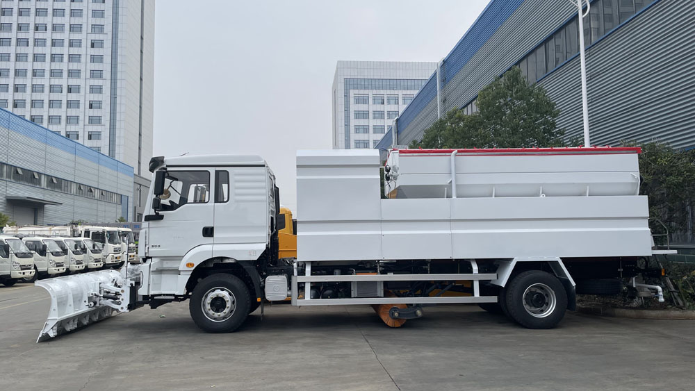 - 后置融雪撒布機:車輛尾部配備融雪撒布機,在冬季除雪過程中拋灑融雪劑,防止濕滑的路面結冰影響交通,覆蓋過融雪劑的路面能很好地解決路面結冰問題,使車輛安全通過,不受天氣影響 。