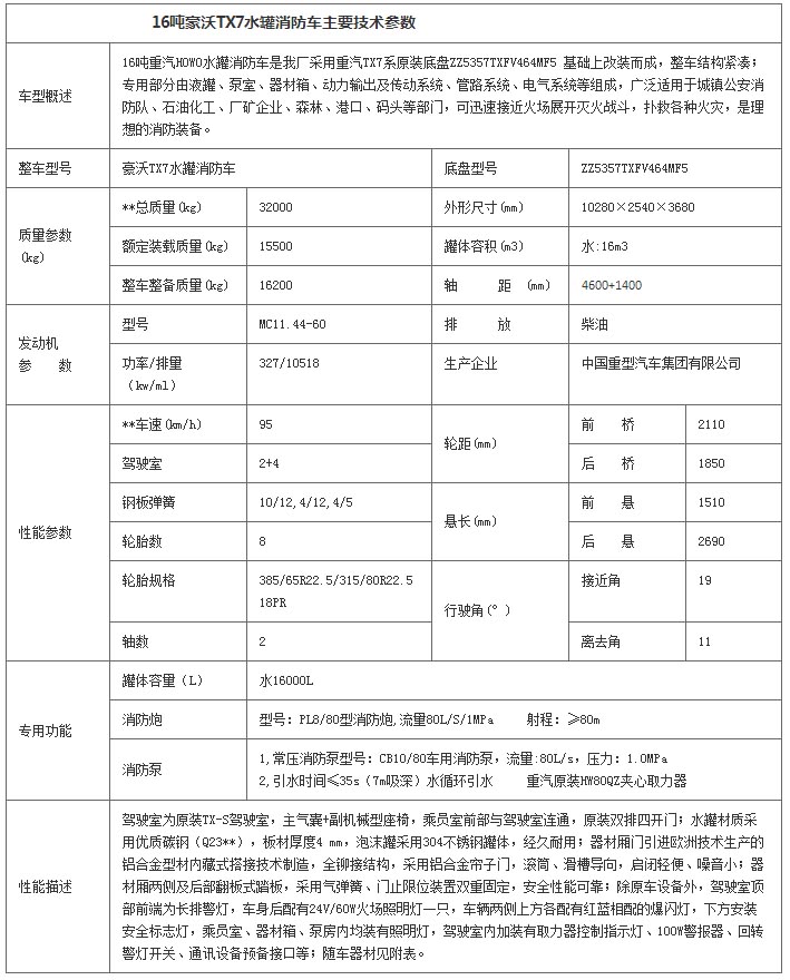 備注 選裝后部帶拉梯架裝置及隨底盤部件布局選裝不同側(cè)面樣式。水罐容積為15.800立方米,水罐尺寸:4420×2450×1530mm。整體式側(cè)防護(hù)結(jié)構(gòu),后防護(hù)裝置材料:Q235A,截面尺寸:120×120mm,與車輛連接方式:螺栓連接,后防護(hù)離地高度:435mm,ABS生產(chǎn)企業(yè)為威伯科(上海)管理有限公司,型號為4460046300。主要專用裝置有消防泵、消防炮。